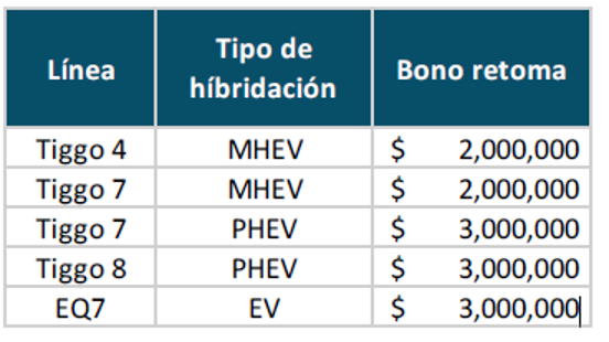 Si realizas la compra de un vehículo marca Chery de las referencias TIGGO 4 PRO MHEV, TIGGO 7 PRO MHEV, TIGGO 7 PRO PHEV, TIGGO 8 PRO PHEV, EQ7 ELÉCTRICA y como parte de pago entregas para retoma tu vehículo usado de cualquier marca, recibe un bono de descuento hasta 3 millones, remítase a la siguiente tabla: