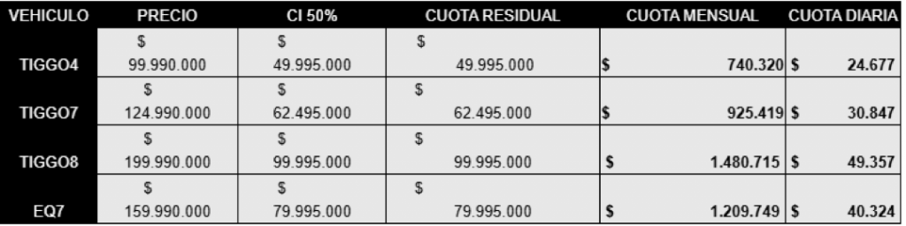 Plan 50/50- COMPRA INTELIGENTE El Plan de financiación anunciado aplica para vehículos nuevos ofrecidos exclusivamente por la red de concesionarios Chery. Los equipamientos, accesorios, y colores hacen parte de la ambientación fotográfica. Por esta razón pueden no corresponder con las referencias y modelos comercializados en Colombia. El plan de financiación podrá ser otorgado únicamente por entidades financieras aliadas a Banco Santander De Negocios Colombia S.A. y estará sujeto a las siguientes condiciones: el solicitante deberá pagar una cuota inicial por un valor mayor o igual al 50% del valor total del vehículo (i) Se financiará máximo el 50% del valor total del vehículo: el cliente solo cancelara cargos fijos , seguros e intereses corrientes durante 24 o 36 pagos mensuales y el 50% restante en un único pago residual realizado en el mes 24 o 36 según corresponda (Lo anterior puede variar en caso de presentarse incumplimientos al cronograma de pagos); (ii) Adicional a las cuotas establecidas en el numeral (i) inmediatamente anterior; (iii) La tasa de interés aplicable será fija una vez acordada, y la tasa aplicable a cada solicitante podrá variar de acuerdo con el perfil crediticio del solicitante; (iv) El plazo máximo de financiación será de hasta 36 meses; (v) El solicitante deberá contratar, de forma previa al primer desembolso, las siguientes pólizas de seguro: